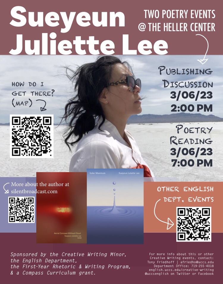 I’ll be reading some poems and leading a deep listening workshop at the University of Colorado Colorado Springs. On Monday, March 6, I’ll be giving a craft talk at 2pm, then reading at 7pm–both at the Heller Center.