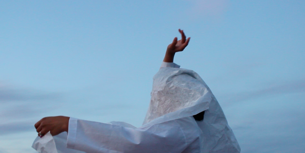 In an effort to accomplish this discharge, this videopoem features several poached aspects of the Korean traditional dance form salp’uri. (살풀이) which is an ancient ethnically Korean shamanic dance commonly recognized as a dance of exorcism. In it, a solo dancer moves meditatively with a long white sash, helping to release negative energies. In my re-imagination of this form, the sash is used as a conduit for transmission between the light and my body, communicating energies and desires in both directions.